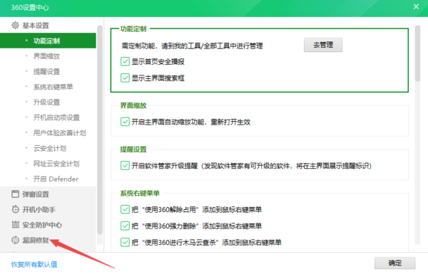 2、进入到360安全卫士的设置中心界面后,我们在左侧的列表中找到【漏洞修复】选项,并点击它。