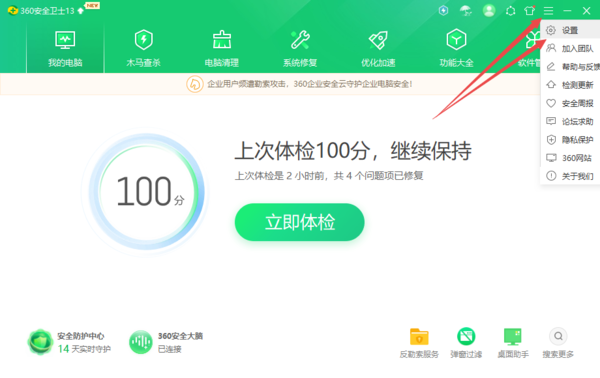1、启动电脑上的360安全卫士软件,点击界面顶部右上角的【三】主菜单图标,然后在弹出的选项中,选择【设置】选项。