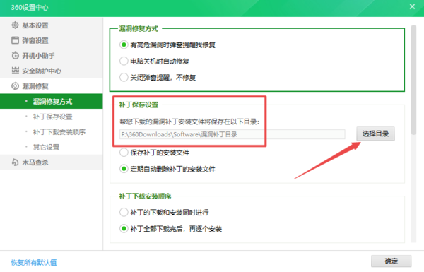 在360安全卫士设置中心的漏洞修复选择中,我们找到【补丁保存设置】选项,然后在该选项的下方,我们就可以看到当前补丁的保存路径位置,想要进行路径的更改的话,直接点击该路径右侧的【选择目录】按钮,来进行补丁保存路径位置的修改即可。