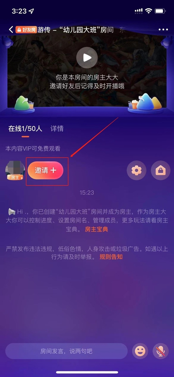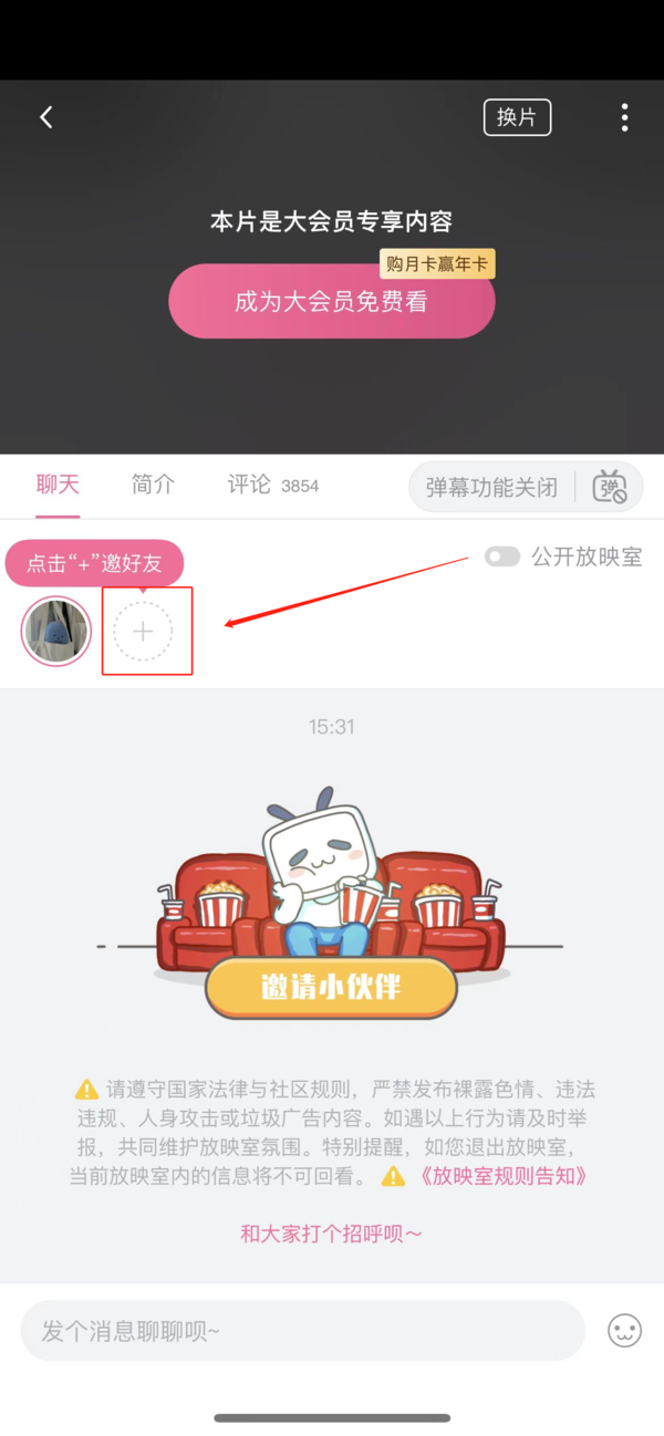 在之后出现的“放映室”中点击头像旁边的“+”就可以把好友邀请进来一起看了。