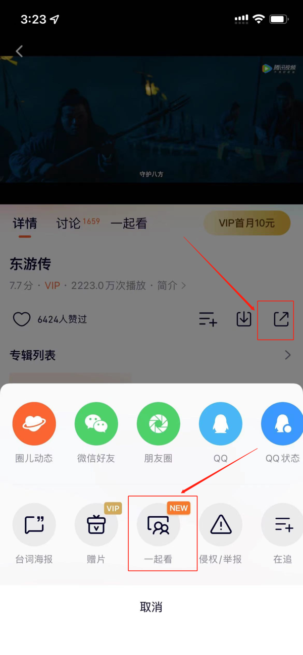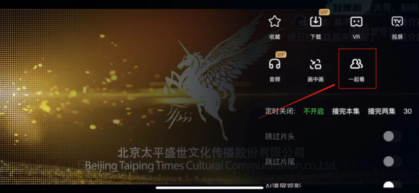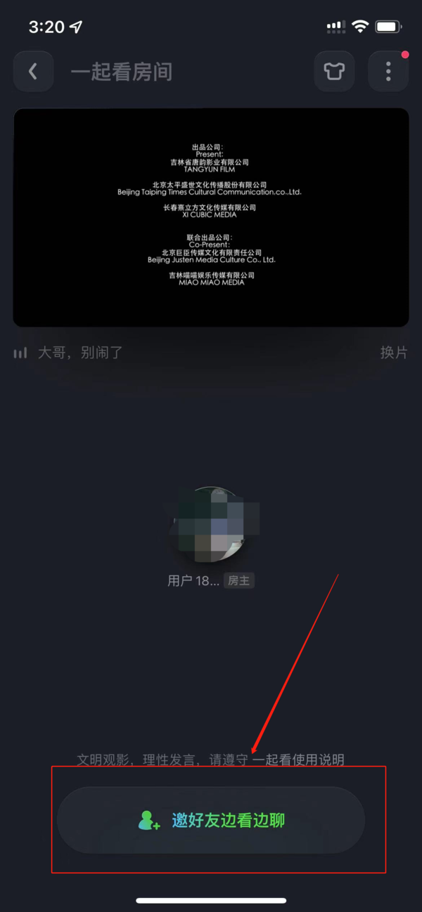 腾讯视频同样可以邀请好友和自己一起看电影,和爱奇艺同样是要使用手机端的腾讯视频app来实现这一功能。同样也是先找到想要播放的电影,然后不要放大画面,在播放界面下面一点点的位置找到一个类似于“分享”的按钮,然后选择“一起看”,这时候也会跳转到一个房间中。