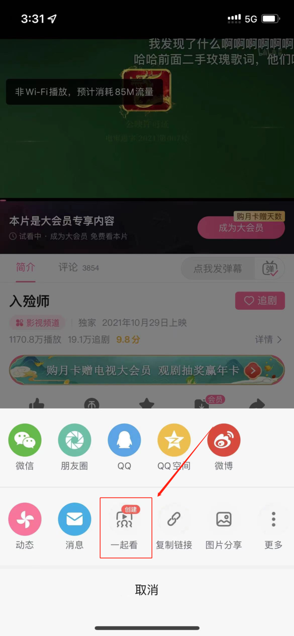 和上面提到的两款软件一样的是bilibili也是可以通过手机端来实现与好友一起看电影的需要的,同样也是在手机中打开b站,找到自己想要看得电影后,在下面找到一个如图所示的“分享”按钮,然后在出现的选项中选择“一起看”。