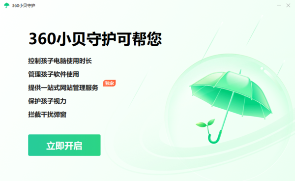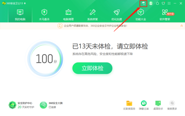 打开360安全卫士后,右上角有一个雨伞样式的图标,这就是青少年模式的启动按钮,点击就可以进入到设置界面。