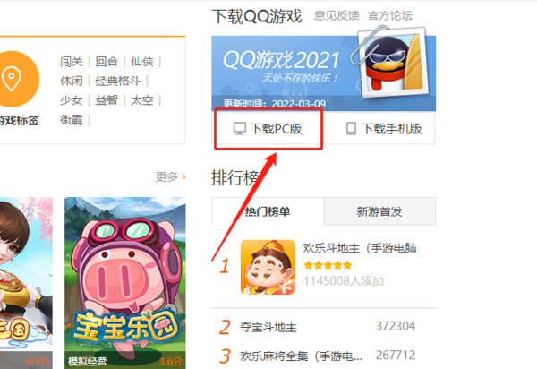 首先搜索并进入qq游戏大厅的官网,把页面向下拉一些,就可以在右侧找到下载qq游戏大厅安装程序的选项,点击“下载PC版”就可以下载安装包了。