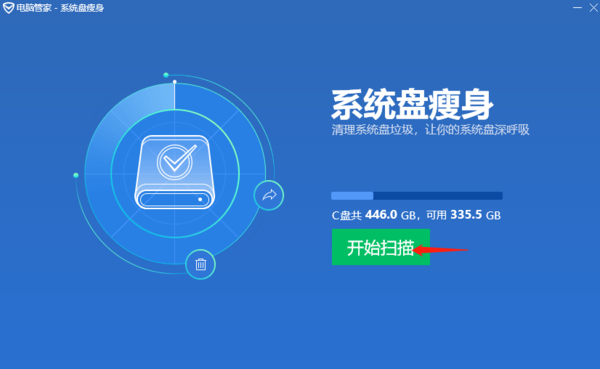 我们来到系统盘瘦身界面之后,可以看到自己系统盘的存储空间情况,如果想进行进一步清理,那我们先点击【开始扫描】。