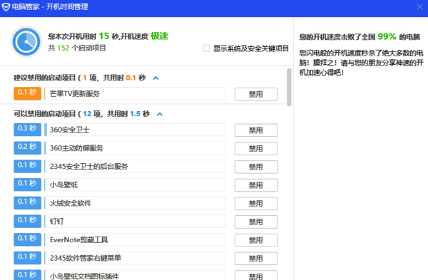 在这里,我们可以看到管家建议禁止/保留的开机启动项,对此我们可以选择听从建议,也可以自己选择禁止启动哪些项。