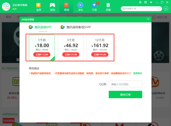 360软件管家中的商城售出的相关增值业务的价格会比直接开通的要低很多,例如腾讯视频的会员,官方开通的价格是30元一个月,但是在360软件管家商城中充值,只需要18元一个月。