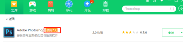 在360软件管家中下载Photoshop时可以看到上面会显示“试用7天”的提示,这里的试用7天是由于360软件管家中提供下载的都是正版的软件,而Photoshop官方是有规定的,一台设备对于这款软件的试用时间只有7天,超过7天后就无法再使用了,即便是卸载重新安装也无法免费使用了。