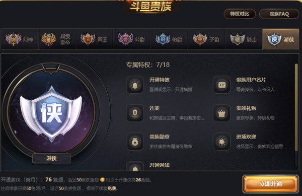 4、关于贵族鱼翅返还特权,只要在贵族开通成功之后,立即就会收到官方返还的贵族鱼翅。