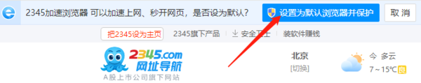 1、在默认情况下,我们打开2345加速浏览器后,会在整个界面的上方,看到弹框,此弹框也是在询问我们是否将2345加速浏览器设置为默认浏览器,如果我们需将其设置成默认的话,点击【设置为默认浏览器并保护】,这样一来,2345加速浏览器就是默认浏览器,且如果我们的电脑有2345安全卫士的话,卫士还能进一步保护我们的上网安全。
