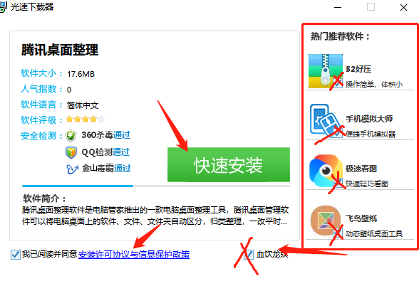 首先,我们将腾讯桌面整理的安装包下载完成之后,打开安装包。在安装包上,这里建议大家除了同意协议以外,其他的可选项都“去勾选”,然后点击【快速安装】。