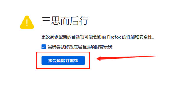 1、首先,打开火狐浏览器,在浏览器上方的地址栏中输入“about:config”然后按下回车键。接下来会显示下图所示的警告内容提醒,这里我们点击“接受风险并继续”按钮。
