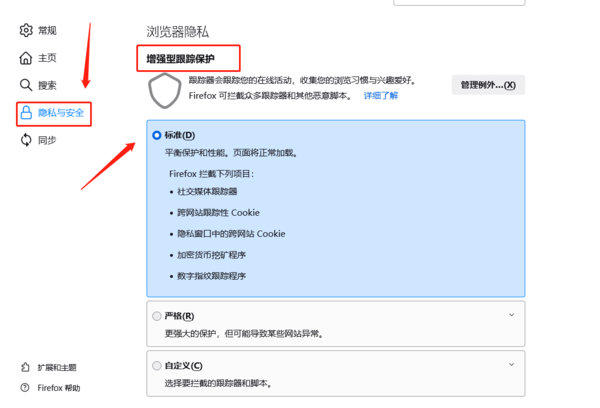 2、然后在左侧的选项栏中找到在隐私与安全设置,接着找到“增强型跟踪保护”选项,这里如果选择的是严格,那就将其切换为标准;如果选择了标准,就改为自定义,将所有的选项全部都取消勾选就可以了。