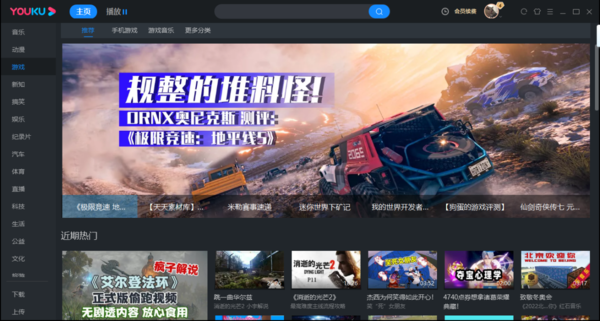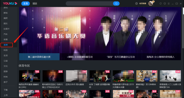 首先打开电脑中的优酷客户端,在主界面的左侧导航栏中向下拉,找到“直播”选项后点击,这时候右侧就有各类型的相关直播视频了。