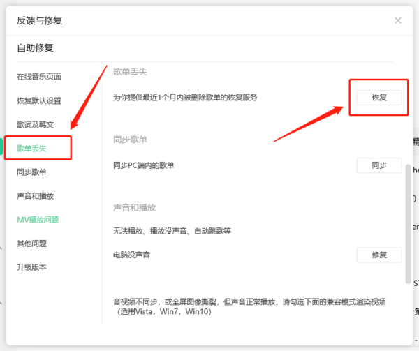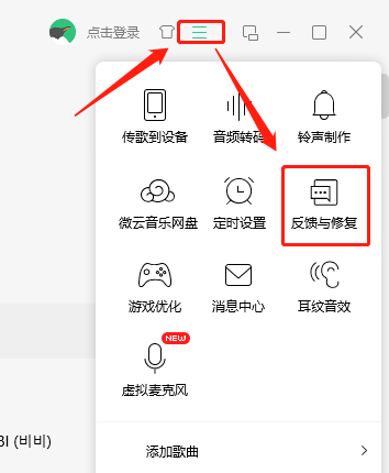 打开qq音乐客户端后,在右上角附近找到一个三条横线样式的菜单键并点击,然后在出现的选项中选择“反馈与修复”,在弹出的窗口左侧单击“歌单丢失”。