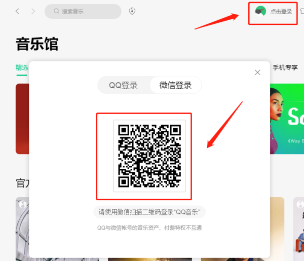 我们第一次在电脑端qq音乐进行账号登录时,要先点击右上方附近的“点击登录”。然后会有登录方式的提示框跳出,我们在这里选择是选择“QQ扫码登录”或是“微信扫码登录”,然后使用对应软件扫描二维码就可以了。