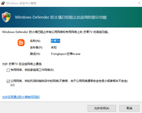 1、来自Windows的安全警报。其主要内容为Windows?Defender默认会让防火墙阻止专用网络及公用网络中芒果TV的一些功能,而询问的目的则是让我们决定是否让芒果TV恢复成“允许访问”状态。我们要做的是:根据自己的网络环境选择专用还是公用网络,然后点击右下角“允许访问”即可;不然的话,我们在使用芒果TV的过程中可能会受到影响。