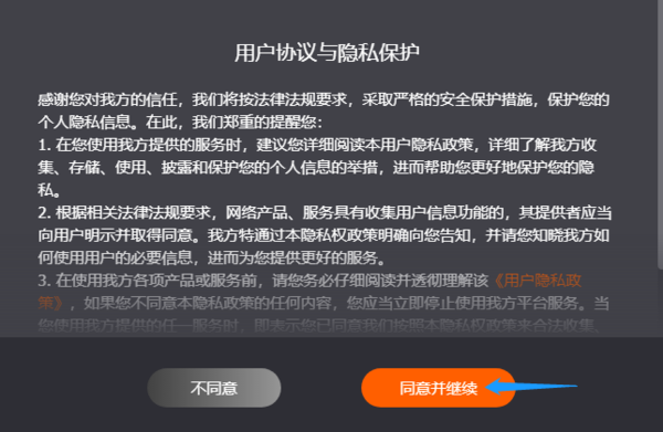 2、来自芒果TV的《用户协议与隐私保护》。这个是芒果TV官方与用户建立的一些协议,主要还是对双方的保护,我们只需点击右下方的“同意并继续”即可;如果点击“不同意”,则无法使用芒果TV。