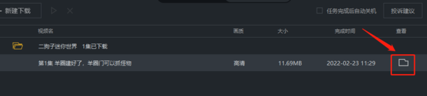 我们在“已下载”中找到刚刚下载的视频,点击后面的文件夹样式的图标就可以直接打开视频在本地的存储位置了。