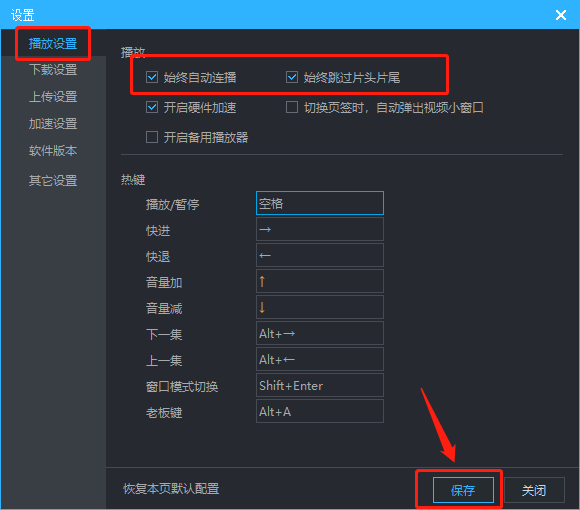3、勾选完毕之后,在窗口最下方点击“保存”,重启播放器后就可以生效了。