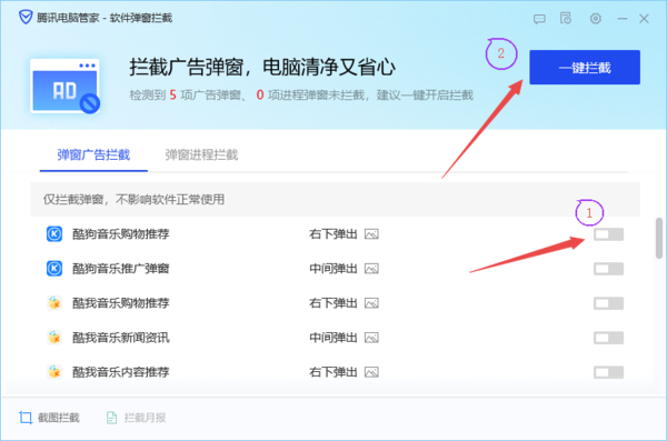 或者是直接点击界面顶部的【一键拦截】按钮,来将所有的广告弹窗全部进行拦截即可。