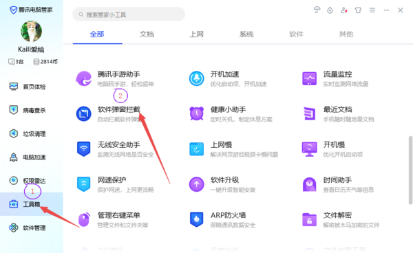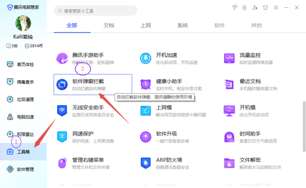 2、进入到腾讯电脑管家的工具箱界面当中后,找到【软件弹窗拦截】功能,并点击进入。