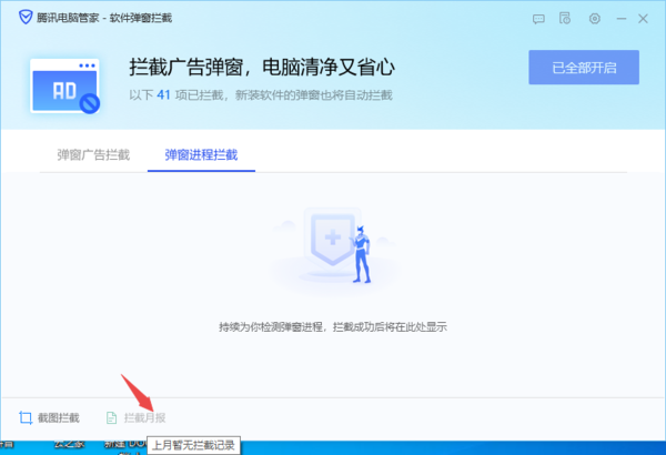 5、同时,点击界面底部的【拦截月报】功能,我们还可以查看腾讯电脑管家为我们所拦截的月日志记录了。