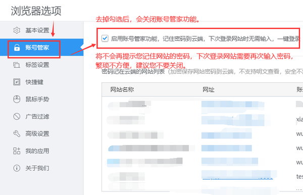 这里我们需要注意的是,如果关闭了账号管家的功能,之后访问网站就不会再有保存网站密码的提示,再次登录该网站时就需要再次输入账号与密码。