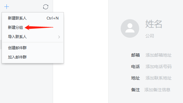 2、管理分组。当我们的网易邮箱大师中联系人达到一定数量时,可能会让我们眼花缭乱;这会儿我们就得弄些分组,对当前的联系人进行分类。同样地,我们点击左上方加号,选新建分组,接下来会在中间弹出小框,我们键入文本创建分组名称即可。
