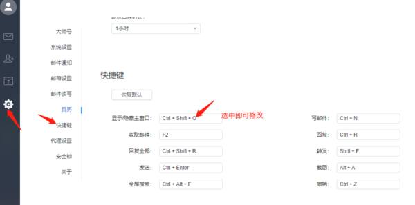 我们依次点击设置→快捷键,就可以找到网易邮箱大师的快捷键配置了,对于想修改的快捷键,我们只需选择其文本框,然后在键盘按下单个/组合键即可;但这里要注意一点:不要和其他的一些快捷键冲突哦~