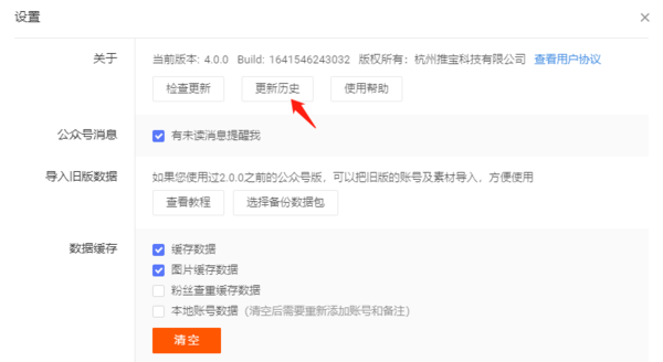 我们打开电脑版微小宝,点击主界面右上角的“箭头”,找到并打开“软件设置”。在设置界面里就可以找到“更新历史”,点开后会弹出微小宝更新日志的网页。这个网页是以网页版云文档的形式呈现给我们,而且其中包含“可互动式目录”,我们可以在页面上轻松找到自己要找的版本更新日志,可以大大节省用户在查找上花费的时间。