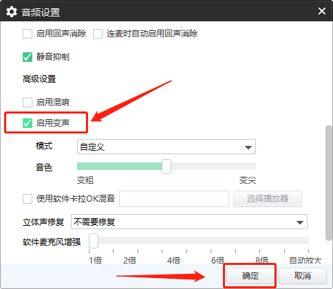 在“音频设置”中拉到最下面,勾选“启用变声”,我们还可以在下面来修改变音的模式及音色,都设置修改好后点击“确定”即可。