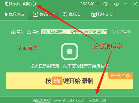 4、反馈渠道广。大家在用其他一些软件,遇到问题的时候,可能都找不到问题反馈渠道,直接陷入束手无策的状态。但鼠大侠连点器可不一样,它拥有客服和页面反馈2种渠道,竭力解决用户在使用鼠大侠连点器过程中的种种问题;另外,鼠大侠也肯于、善于聆听用户的心声,原因在用户的“鞭策”下不断进步。