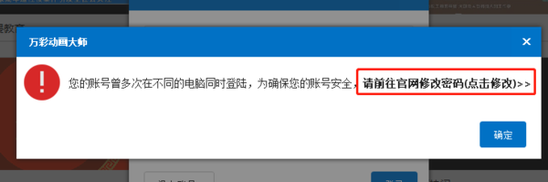 之所以会出现登陆弹窗,是因为我们的账号在不同的电脑同时登录到了软件当中,万彩动画大师的登录账号每次同时只能够在一台电脑上登录,两台及以上数量的电脑同时登陆就会出现登陆弹窗的提示。系统如果检测到我们的账号在很多台电脑中登录过,会自动判定我们的账号存在风险。