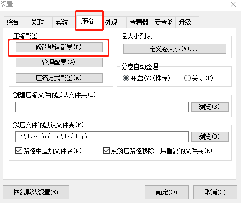 想要修改2345好压默认压缩格式的小伙伴,在电脑上打开2345好压客户端后,点击页面右上角的主菜单键,并选择设置选项。在弹出的设置窗口,选择“压缩”键,在压缩配置一栏中,点击“修改默认配置”按钮。