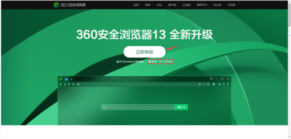 1、打开电脑上的360安全浏览器,然后搜索【360安全浏览器】找到官网并点击进入。进入到官网界面后,我们就可以看到浏览器的最新版的版本号,点击上方的【立即体验】按钮即可进行软件的下载。