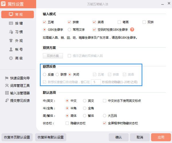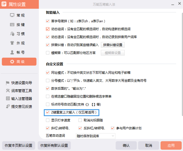 我们在“设置属性”,找到“高级”中,勾选“Z键重复上次输入(仅五笔适用)”,最后点击应用或确认,就可以开始使用z键了。