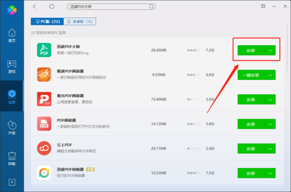 下载方式3:使用电脑中的软件管理工具下载,小编使用的是电脑管家,进入后搜索“迅读PDF大师”然后点击后面的“安装”就可以下载安装了。如果使用的是其它的的软件管理工具,方法也是一致的。