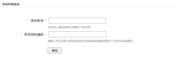 如我们想查询申诉结果,仍然是先进入yy安全中心官网,登录账号后找到“申诉结果查询”,填写申诉账号,并填入邮箱或手机中接到的17位申诉回执编码就可以查询到结果了。