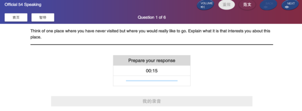 对于很难做到“拟真”的口语,小站托福也是做的尽可能地还原考场环境,让诸位考生在使用电脑端小站托福训练的时候也能颇有效果。我们进入口语练习环节,上来可以看到一个外国人的图片,或许Ta就是你这场“考试”的“考官”;接着我们点击“next”就可以进入正式考试,我们根据托福口语考试的模式进行答题即可。