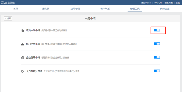 如果想要开启企业微信中的“一周小结”功能,首先我们要找到“管理后台”,然后找到并点击“管理工具”,这时候我们就可以看到“一周小结”的开关按钮了,打开即可向成员发送一周小结了。