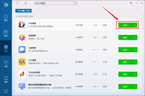 下载方式3:通过电脑管家等软件管理工具下载,在电脑管家中搜索“360小鸟壁纸”,然后点击软件名称后面的“安装”,就可以开始下载安装了。除电脑管家外,类似的软件管理工具都是可以下载到这款软件的。