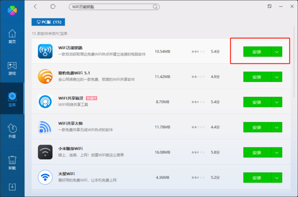 下载方法2:如果电脑中安装了电脑管家,我们可以直接在电脑管家中搜索“WiFi万能钥匙”,然后点击后面的安装就可以了。除了小编提到的电脑管家外,只要是电脑软件管理工具,基本都可以下载到这款软件,下载的步骤都是一样的。