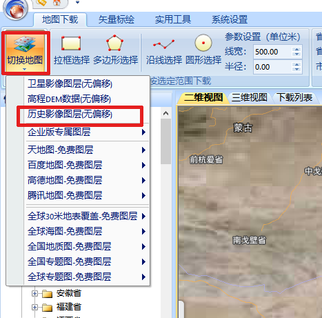 我们在91卫图助手的主界面左上方找到“切换地图”,在下拉菜单中点击“历史影像图层(无偏移)”,然后在右侧的地图数据资料的上方拖动日期来查看某一时间段的影像资料即可。