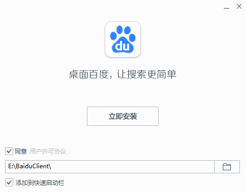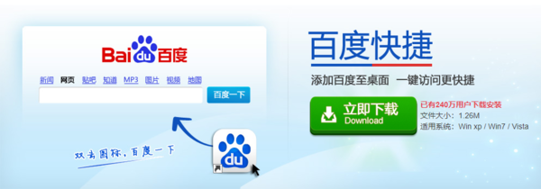 系在方法2:打开浏览器搜索“桌面百度官网”,现在桌面百度已更名为百度快捷,在官网中点击“立即下载”即可。