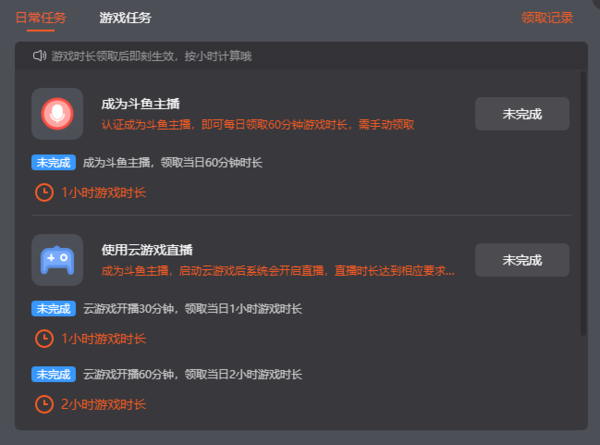 游戏时长是有限制的,成为斗鱼主播可以每日领取60分钟游戏时间,使用云游戏直播并完成相应任务,都可以增加一定的游戏时长。