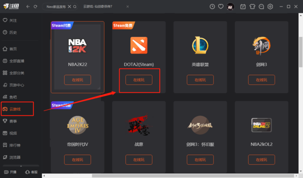 登录斗鱼直播客户端后,在左侧的选线栏中找到“云游戏”,点击进入后右侧会出现游戏列表,选择需要启动的游戏,点击“在线玩”进入游戏程序或游戏平台登录界面。