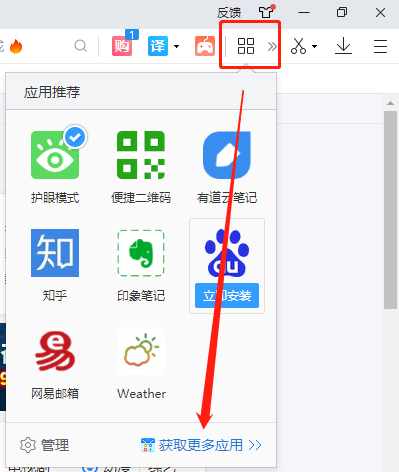 我们首先要在2345浏览器的右上方找到由四个小正方形组成的“进入应用中心”图标,再出现的下拉菜单中,点击“获取更多应用”。