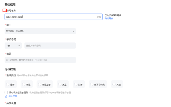 “子账号管理”界面中,我们需要点击“新建子账号”,在子账号创建页面中,我们需要填写一些基础的信息以及该账号的岗位权限内容,这里我们要注意的是带有红色星号的为必填项,大家根据自己的需要填写即可。