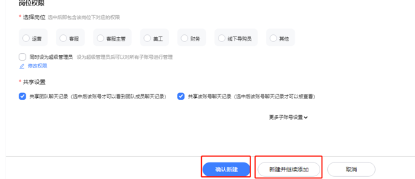 填写完毕后,如过不需要再添加其它子账号,点击下方的“确认新建”,还需添加更多的子账号,点击旁边的“新建并继续添加”即可。